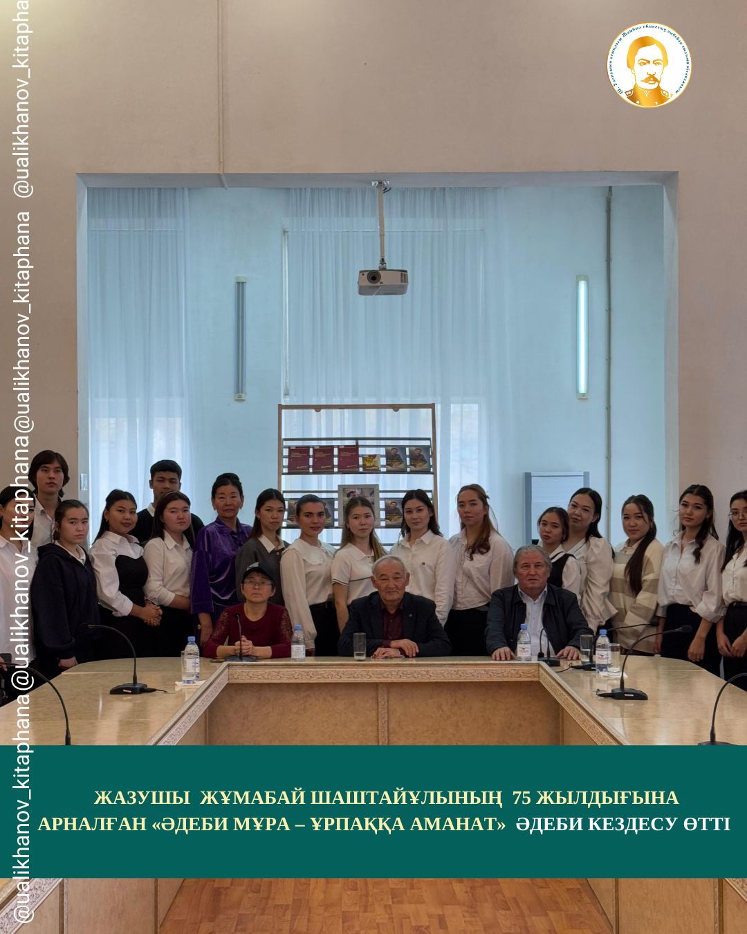 Бүгін кітапханада «AMANAT» партиясының «Кітап–AMANAT» партиялық жобасы аясында  қазақ әдебиетінің көрнекті өкілі, қаламгер, қоғам қайраткері Жұмабай Шаштайұлының 75 жылдығына арналған «Әдеби мұра – ұрпаққа аманат»  әдеби кездесу өтті.