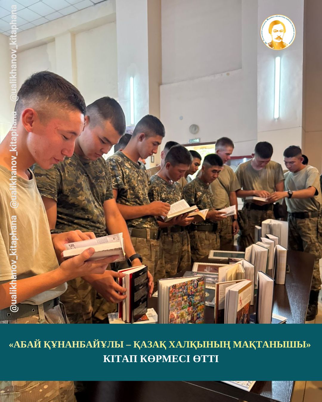 Кітапхана қызметкерлері Қазақстан Республикасы Ұлттық ұланы «Оңтүстік» өңірлік қолбасшылығының 5513 әскери бөлімінде қызмет ететін офицерлер мен келісімшарт бойынша әскери қызметшілерге қазақтың ұлы ақыны, ойшыл және қоғам қайраткері Абай Құнанбайұлының 180 жылдығына арналған "Абай Құнанбайұлы – қазақ халқының мақтанышы" кітап көрмесін ұйымдастырды.